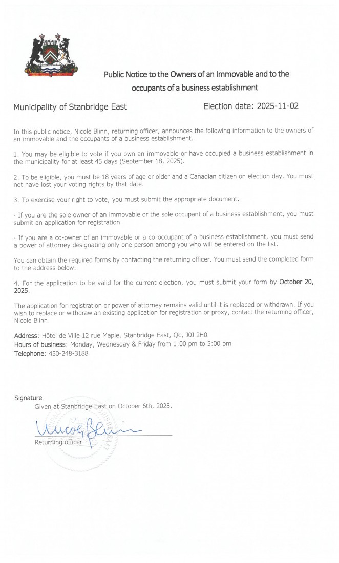 PUBLIC NOTICE TO THE OWNERS OF AN IMMOVABLE AND TO THE OCCUPANTS OF A BUSINESS ESTABLISHMENT: