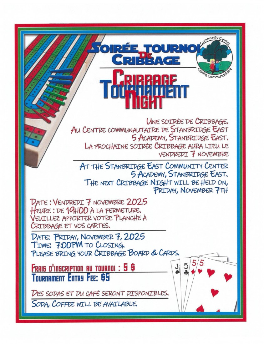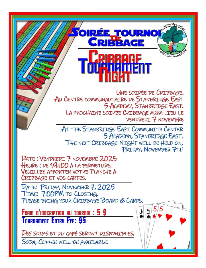 | 7 novembre 2025 | Soirée de cribbage 19h00 - Centre Communautaire, 5 Academy |