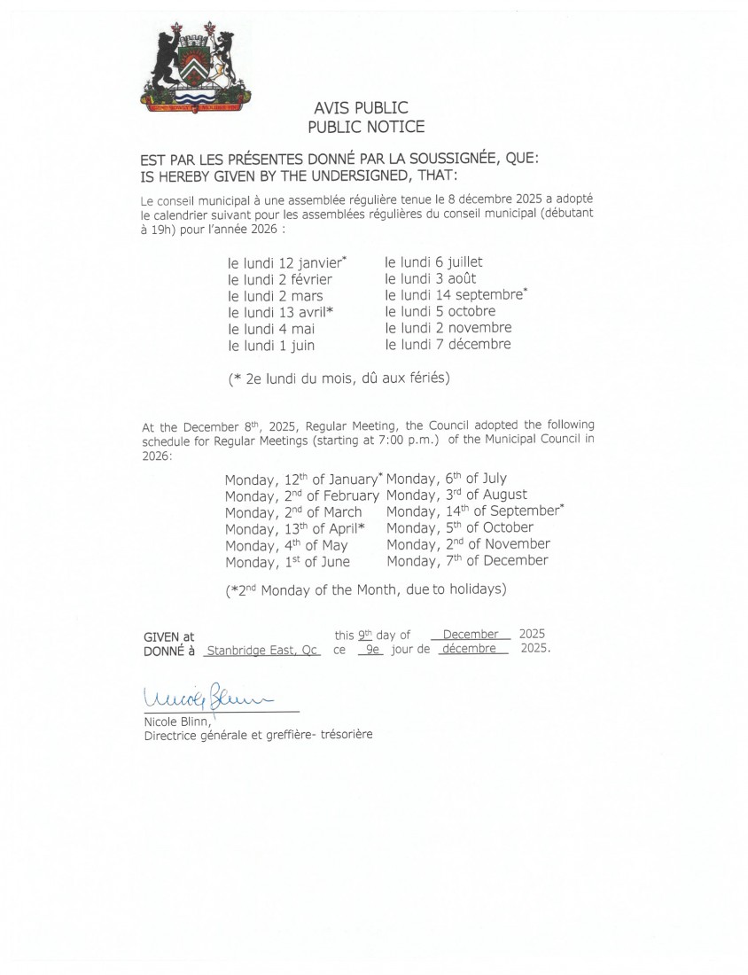 Public Notice Schedule for Regular Meetings of the Municipal Council 2026