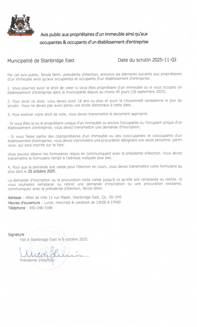 AVIS PUBLIC AUX PROPRIÉTAIRES D'UN IMMEUBLE ET