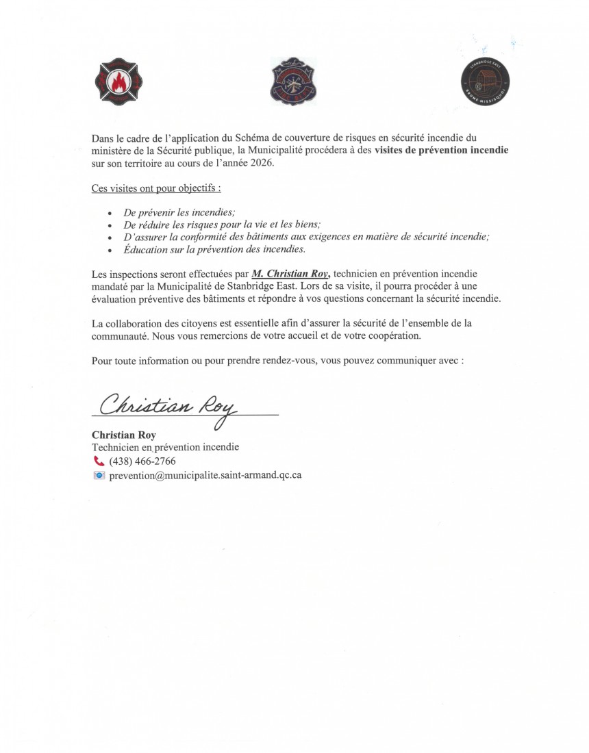 (438) 466-2766 - prevention@municipalite.saint-armand.qc.ca